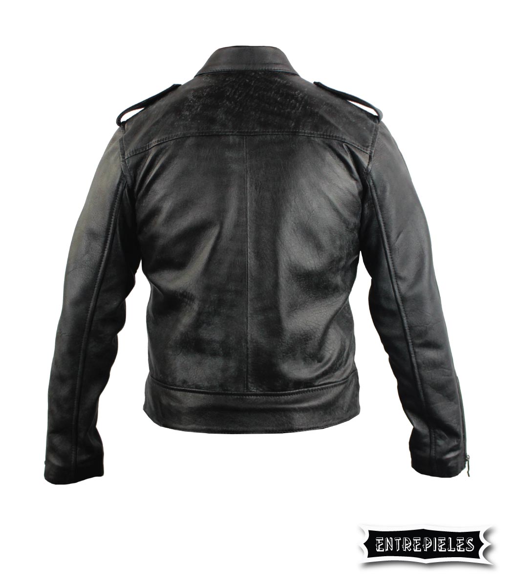 • Chamarra en cuero (elige el tipo de cuero), forrada. Mangas con acolchado y cremallera. Charreteras en los hombros.